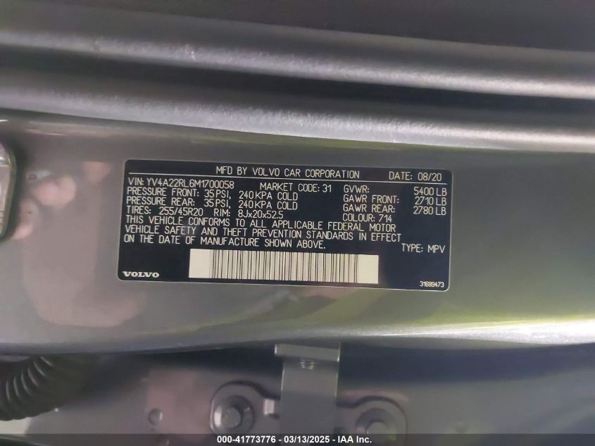 2021 VOLVO XC60 2021 Gasoline, 2.0, Full drive, VIN - YV4A22RL6M1****** from the USA