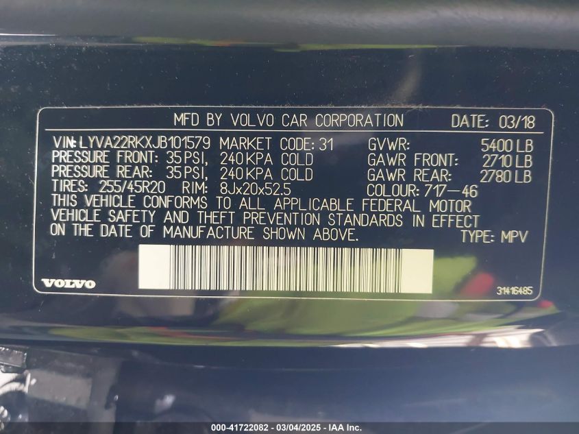 Color BlackCylinders 4Drive Full driveVIN LYVA22RKXJB******State Run & Drive VerifiedDamage Front or backAuction date 2025-03-26 AutoRIA