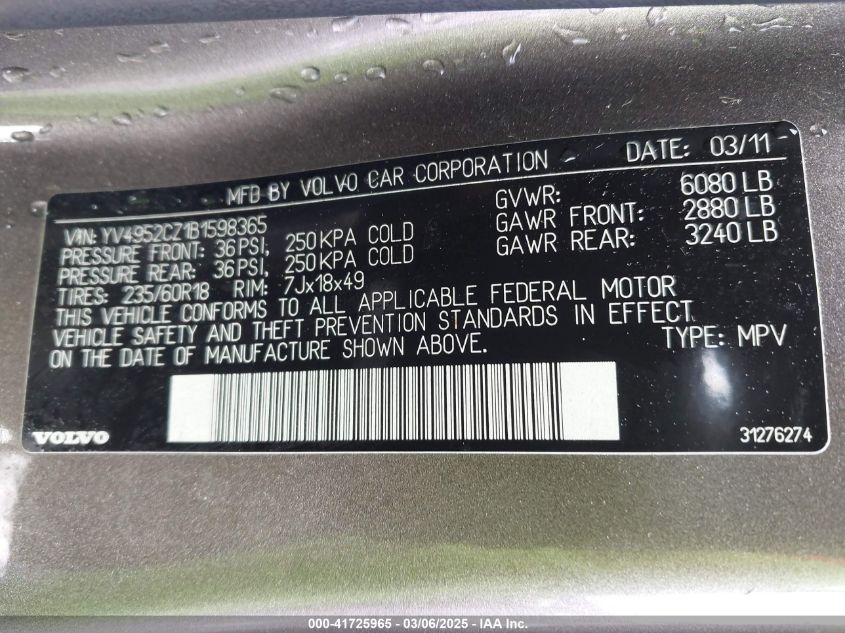 Color BrownCylinders 6Drive Full driveVIN YV4952CZ1B1******State Run & Drive VerifiedDamage Front rightAuction date 2025-03-31 AutoRIA