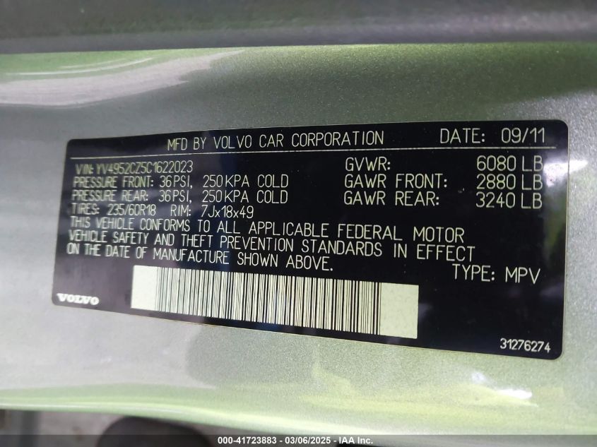 Color SilverCylinders 6Drive Full driveVIN YV4952CZ5C1******State Run & Drive VerifiedDamage Right sideAuction date 2025-03-20 AutoRIA