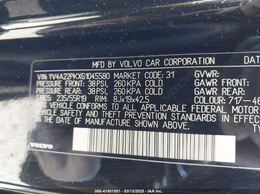 Color BlackCylinders 4Drive Full driveVIN YV4A22PKXG1******State Run & Drive VerifiedDamage It is unknownAuction date 2025-03-21 AutoRIA